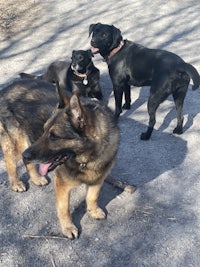 The shepherd is Charlie, the lab standing up is Ash, and the Collie/Lab cross lying down is Jessie.